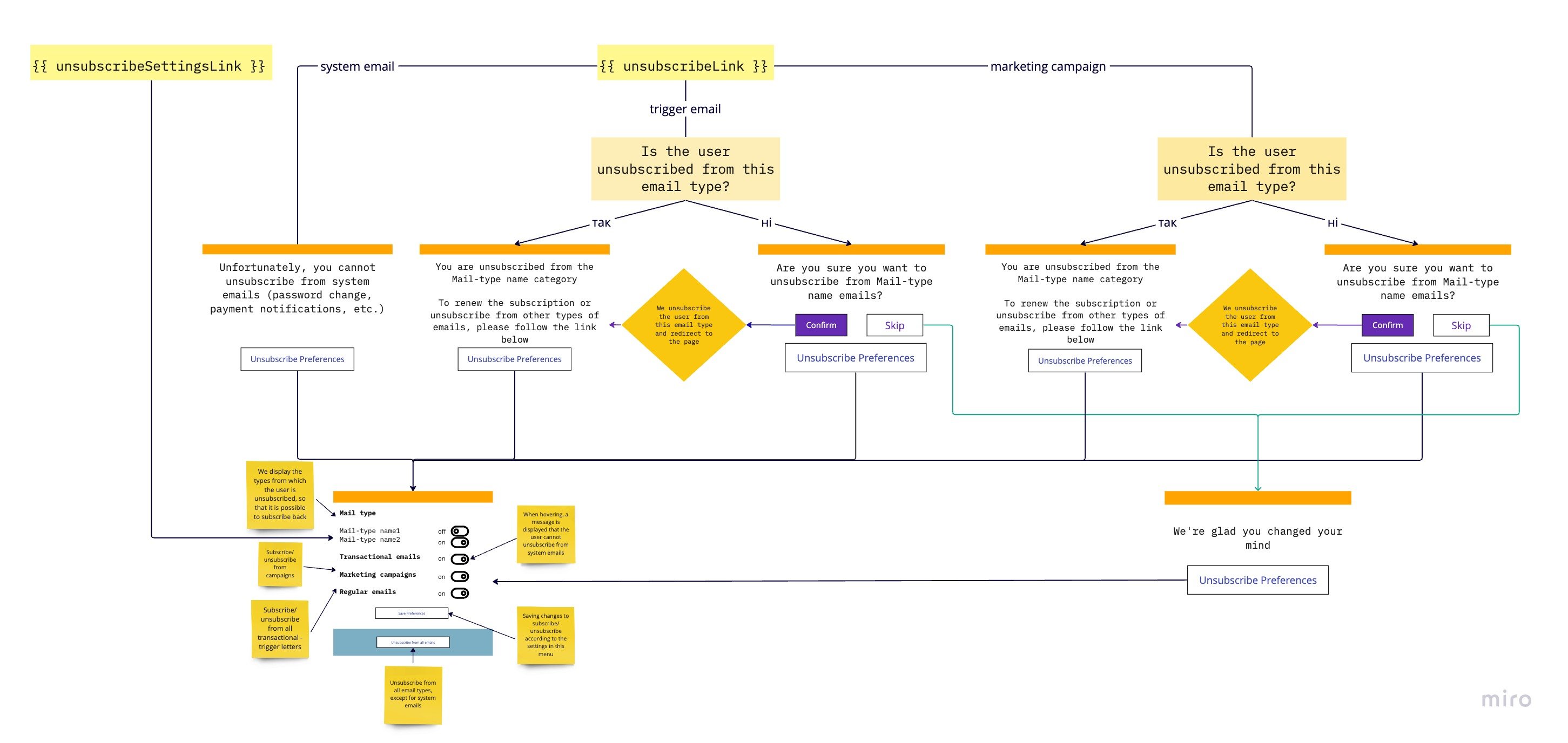 If the user clicks on an unsubscribe link from a system email, we inform them that they cannot unsubscribe from system emails, such as those containing password recovery information or payment notifications. After that, we suggest going to the unsubscribe management page by clicking the Preferences button: